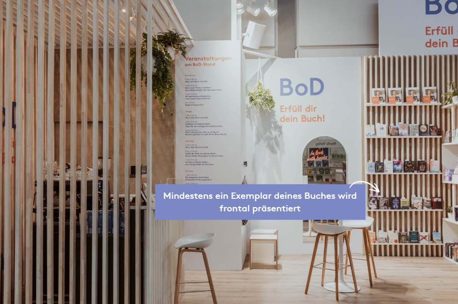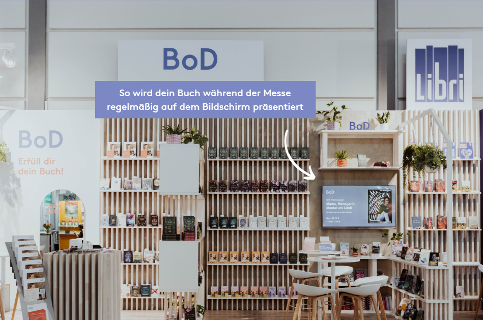 Im Rahmen der Messepräsenz wird dein Titel am BoD-Stand prominent im Wandregal platziert und multimedial in Szene gesetzt. Bitte habe Verständnis, dass deine Buchung erst nach schriftlicher Bestätigung durch BoD verbindlich wird. Die Anzahl der Messepakete ist limitiert und es wird eine Selektion auf Basis der genannten Kriterien vorgenommen.